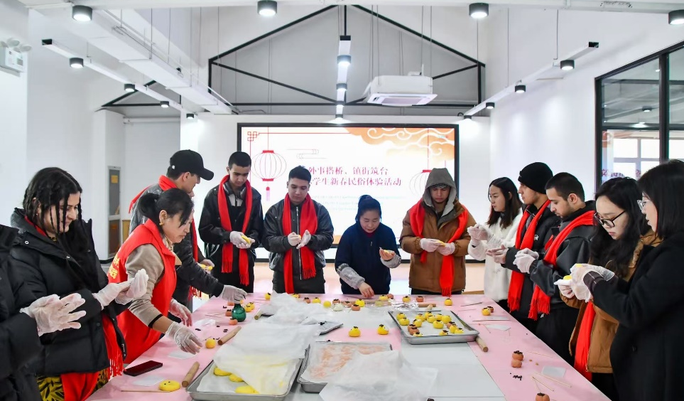 In the Party Member Activity Room and Cadre Lecture Hall, students participated in group folk custom workshops. Under the guidance of pastry chefs, they kneaded dough and filled pastries, handcrafting tangyuan (sweet rice balls) and flower buns symbolizing family reunion. A paper-cutting instructor taught them to create festive window decorations, while in the calligraphy room, they picked up brushes to write various styles of the character "Fu" (blessing). Before colorful lantern riddles, students contemplated carefully, deciphering auspicious meanings behind the puzzles with translation assistance. Within just two hours, participants concluded their journey of Chinese New Year cultural exploration, leaving with handmade folk artworks and rich cultural insights.