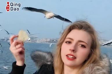 German Girl Went to Qingdao Seaside and Got Seagull on Her Head.